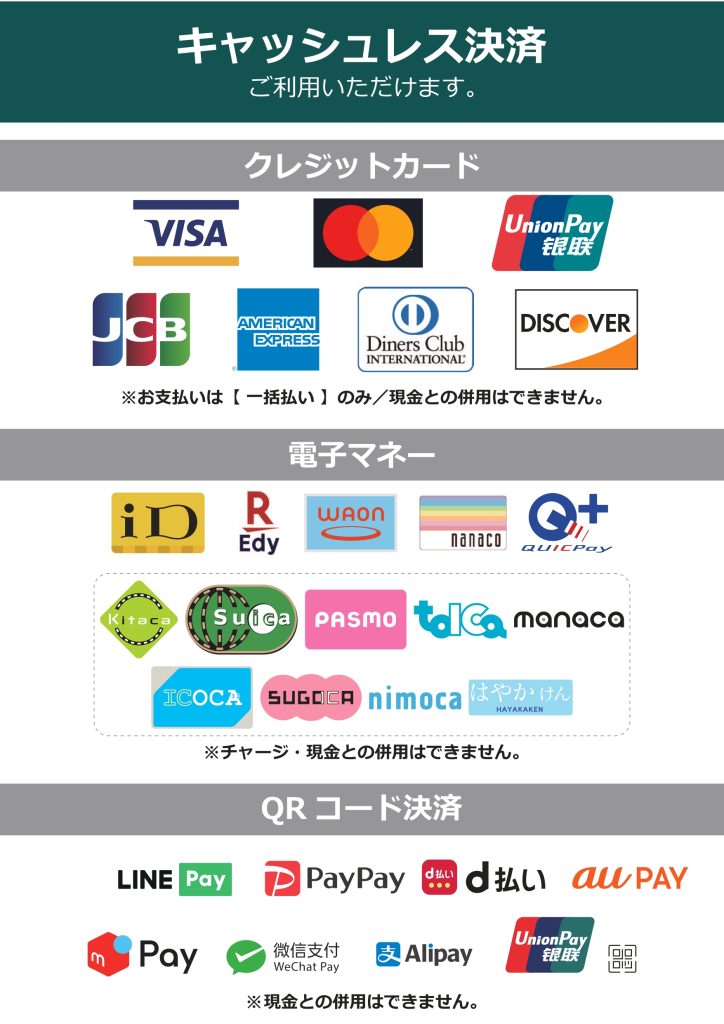 ・お支払いは、現金・クレジットカード・電子マネー(交通系電子マネー/iD/楽天Edy/WAON/nanaco/QUICPay)・コード決済(楽天Pay/PayPay/d払い/au PAY/メルペイ/銀行Pay/WeChat Pay/Alipay)がご利用いただけます。